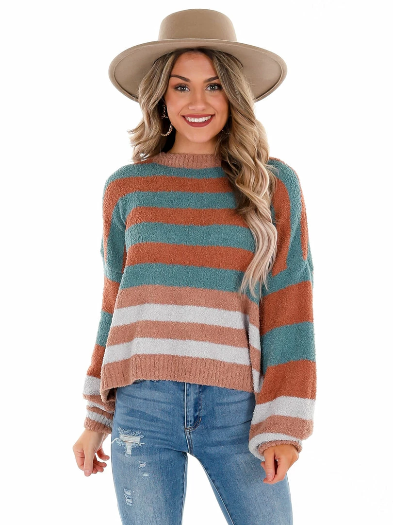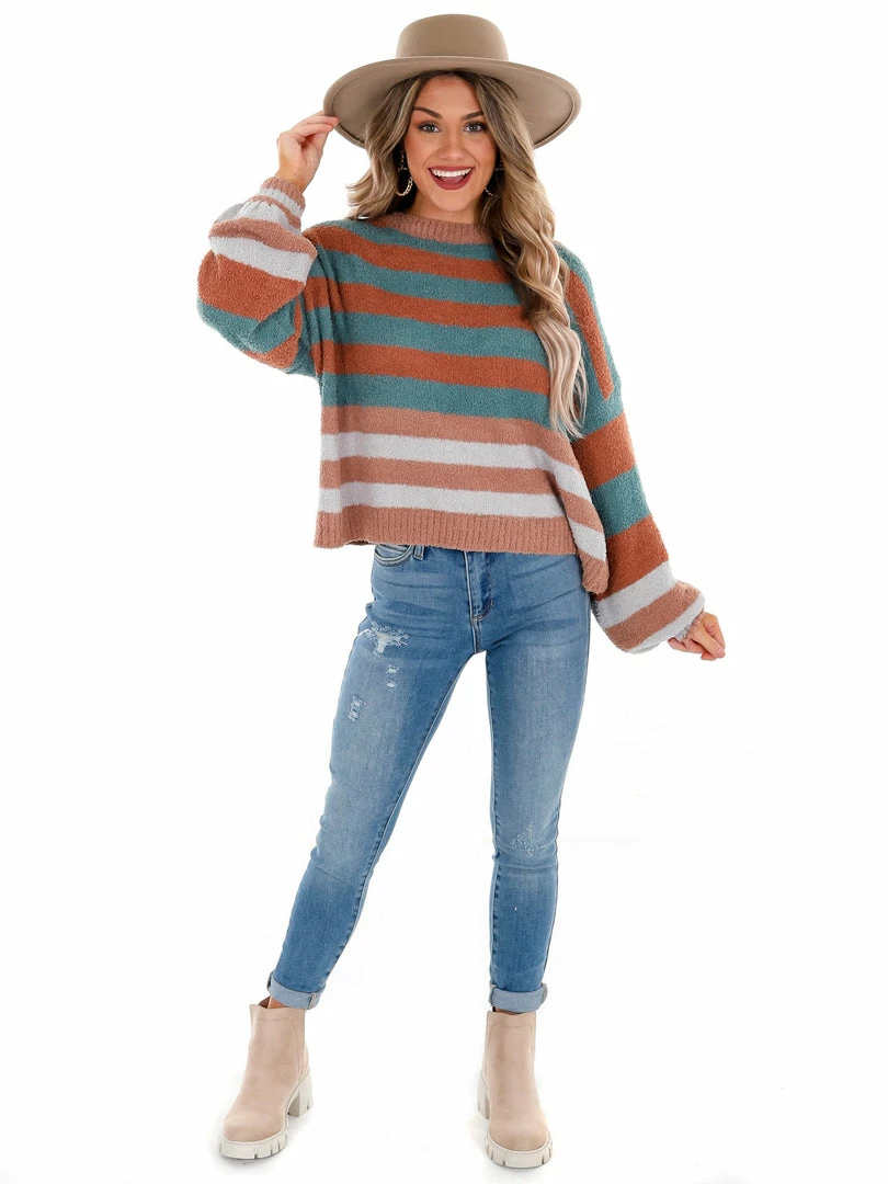 This sweater is as cozy as it is cute, which makes it a must have! Featuring a crew neckline, balloon sleeves and the cutest stripe print, you don’t want to go another second without this top in your closet!