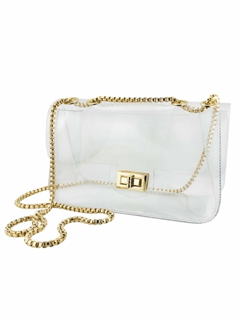 The convertible crossbody easily converts from a handbag to a crossbody bag with this stylish 2-in-1 design. Just double up the uniquely designed gold chain strap for a hand hold, or let the chain slide to its fully extended position for a shoulder bag design. For a simpler style, stick with our all clear design. To dress it up, choose one of our PU leather accented options. The main compartment is perfect for securely storing your personal items with its top flap and turn lock closure.