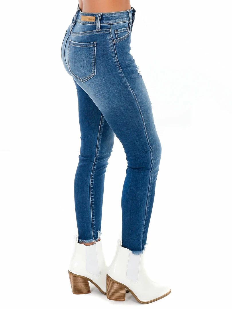 We could not be more obsessed with these skinny jeans! Featuring a high rise fit with a raw edge hemline, minimal distressed details and a dark wash, these jeans are perfect for any occasion! Don’t wait to grab yours!