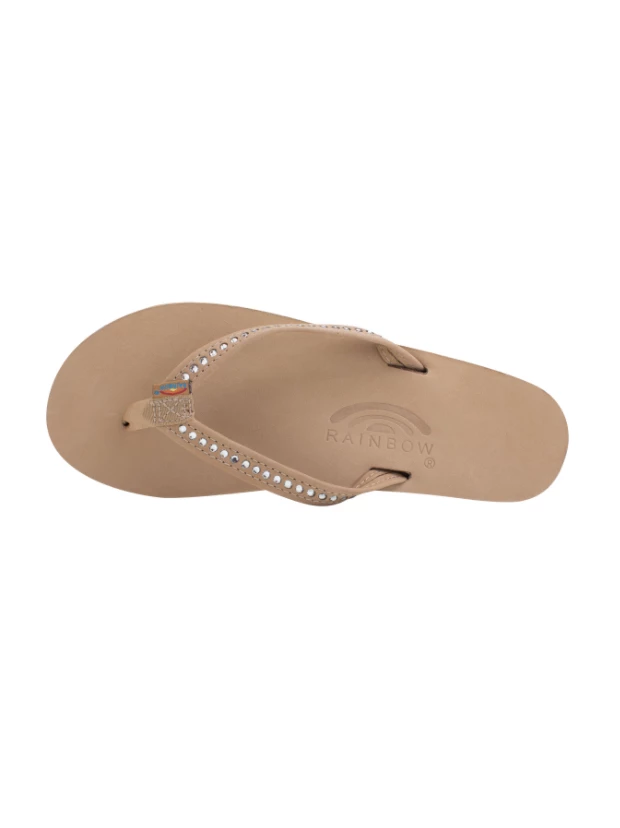 The Crystal Collection is modeled after our popular single layer leather sandal, but the 1/2″ narrow strap being embedded with Swarovskiยฎ Crystals.