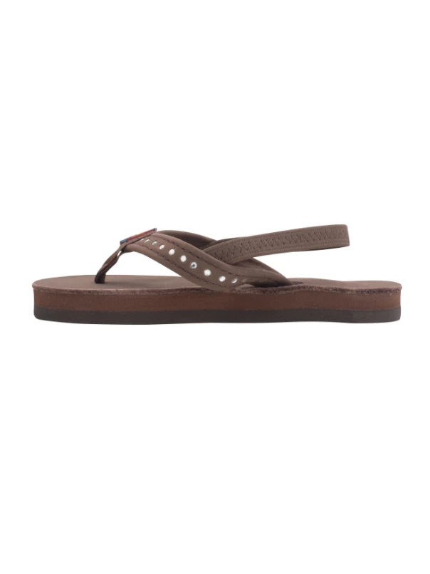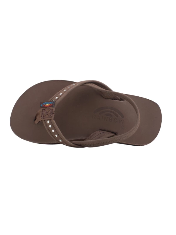 Our kids Premier Leather on a non-slip Rainbow® bottom with a single layer but no arch. The Kids Crystals add a glamorous and feminine crystal embedded 1/2″ narrow strap. Your little angel will sparkle!