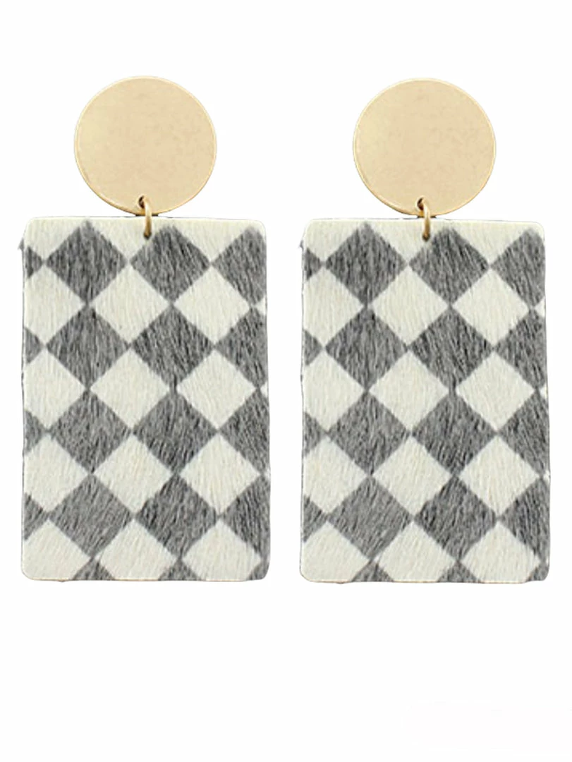 We could not be more obsessed with these new earrings! Featuring a cowhide rectangle with a checker print and gold disc, they are so funky and fun! Don’t wait to grab yours!