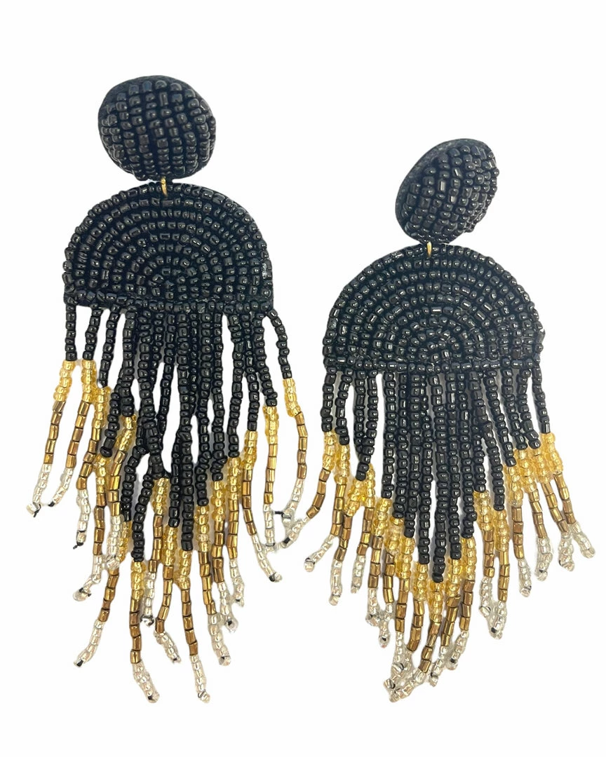 These fringe earrings are so fun! Featuring beaded details all over with geometric shapes and beaded fringe, they are our new favorite statement piece! Throw them on with any outfit to complete your look!