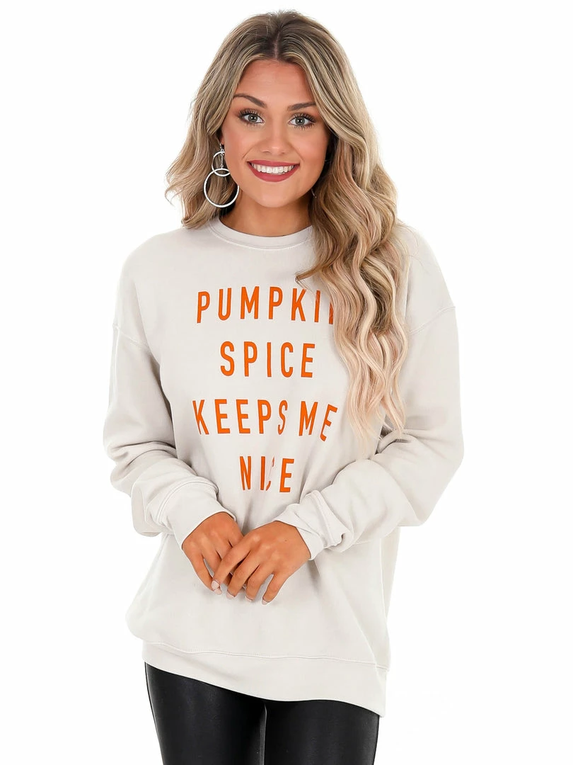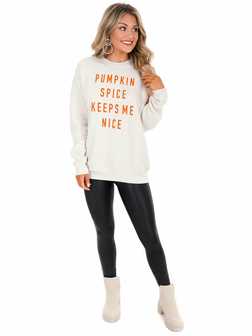 I mean, can you find a more relatable pullover for fall?! We don’t think so! Featuring a crew neckline and the cutest orange “Pumpkin Spice Keeps Me Nice” graphic, this sweatshirt is a must for every fall lover!