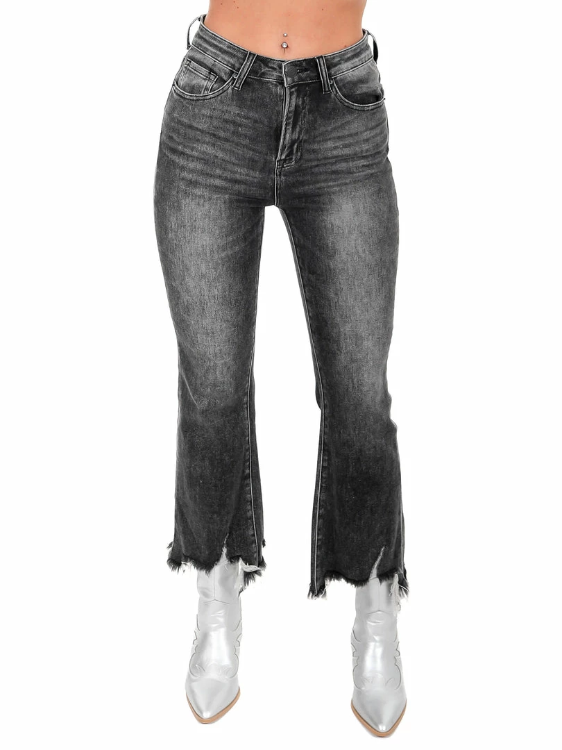 Obsessed is an understatement when it comes to these jeans! Featuring a high rise fit, a slight flare and cropped leg with a raw edge distressed hemline, they could not be more trendy or cute! You are sure to be grabbing these on repeat all season long!