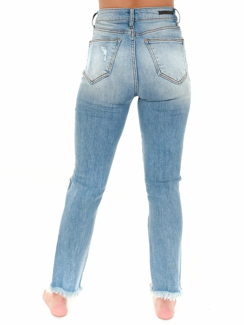 We love a good straight leg jean and this pair is a new fave! Featuring a high rise fit, distressed details, light wash denim and raw edge hem, they could not be better! Throw them on to complete any look all year long! Don’t wait to grab yours!